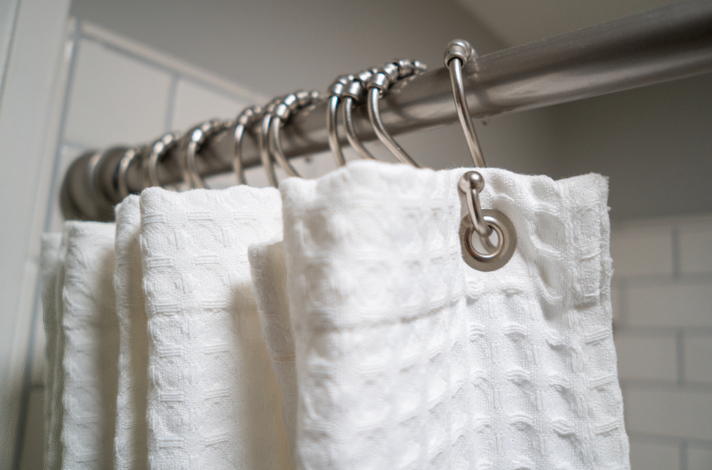 If your bathroom features a dated or discolored shower curtain, replacing it with a new one (preferably with a modern pattern or neutral tone) can make over the entire vibe of the room.